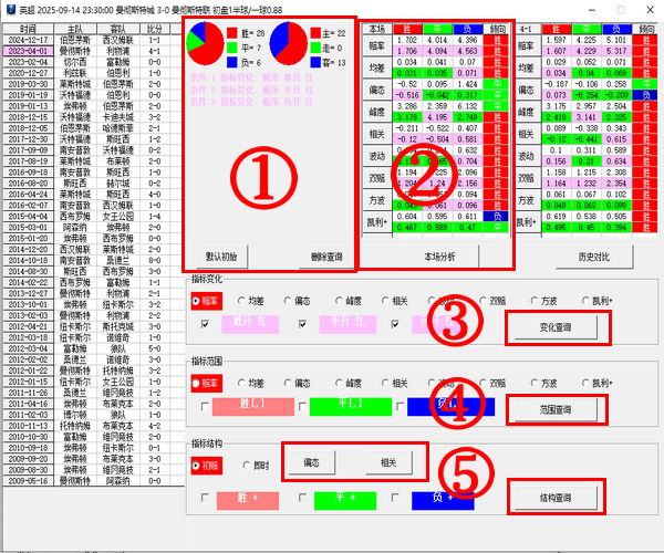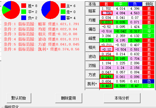 历史统计结果会在①中显示胜平负场次和主赢客赢;查询用到的条件也会注明如"条件1 指标变化 赔率 胜升 红"