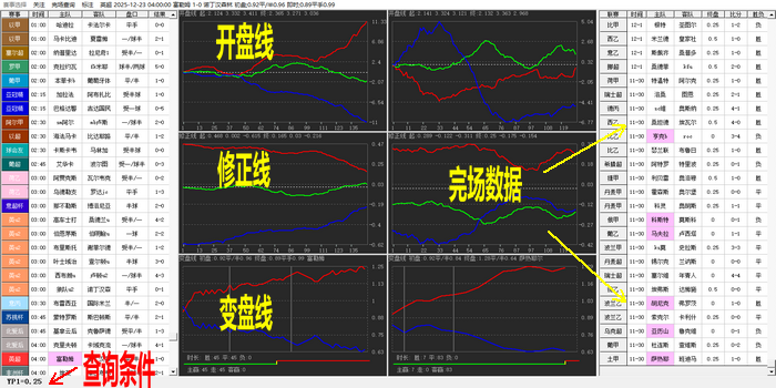 欧赔图形以开盘线和修正线构成数据库(已成库),三条线合成一张图。